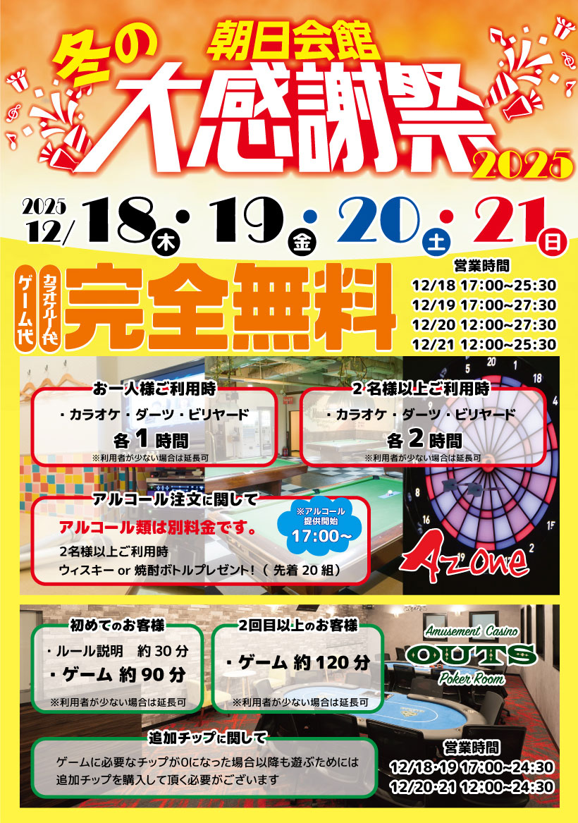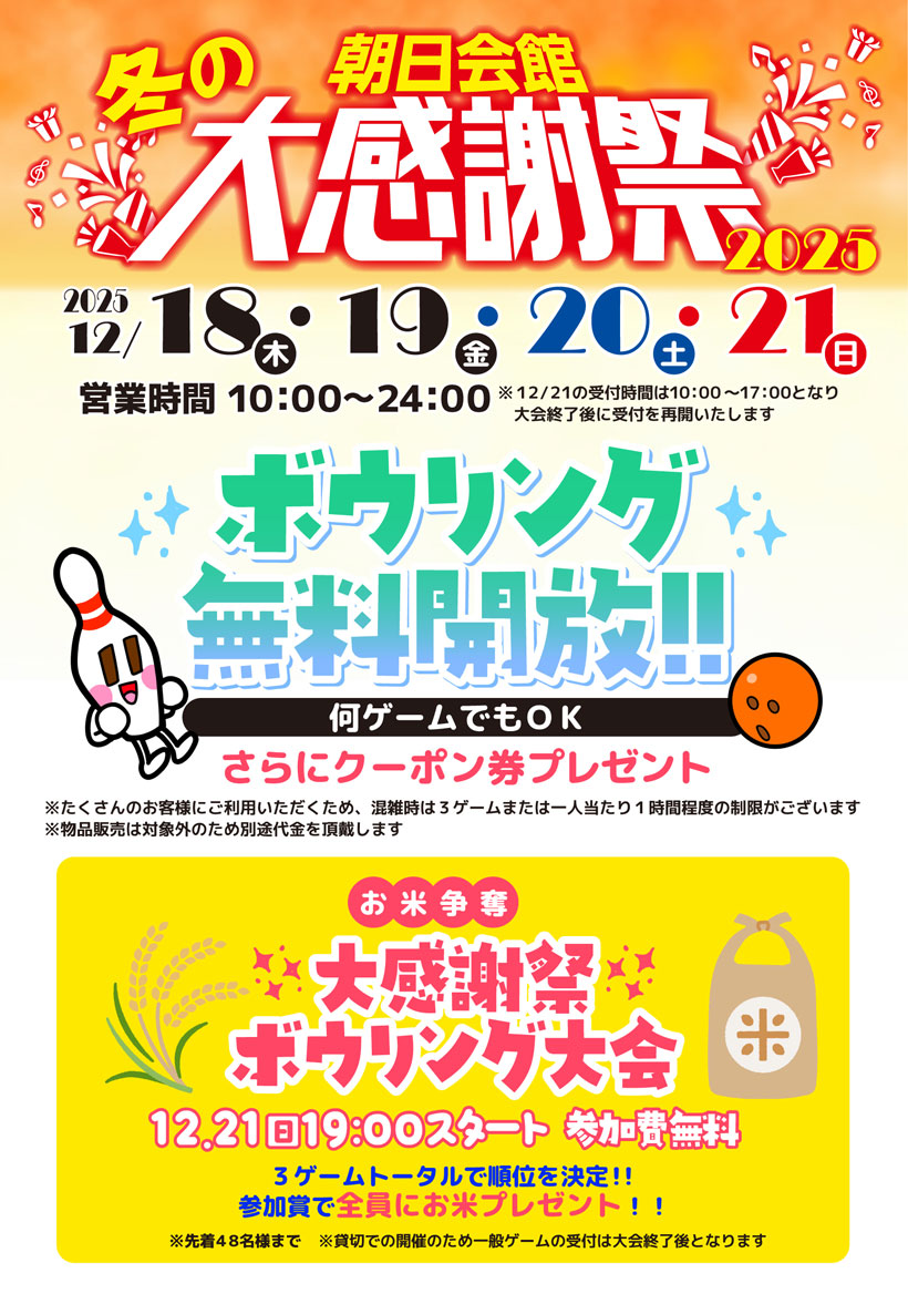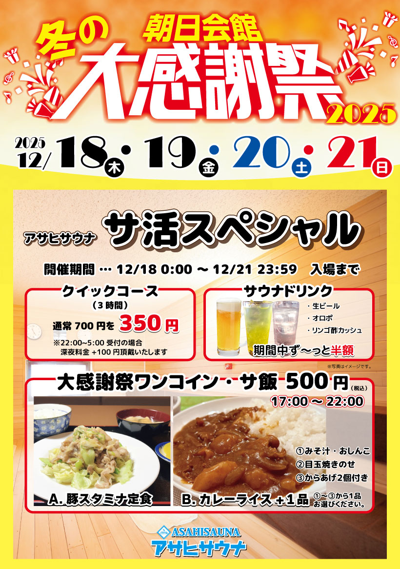冬の朝日会館大感謝祭! Posted on 2025年12月8日 by 朝日会館 夏に開催し大好評だった『朝日会館大感謝祭』、冬も開催いたします! 12月18(木)19(金)20(土)21(日) Azone、フォーラムボウル、アサヒサウナ各店舗が無料開放や超お得なプランでお待ちしています!
