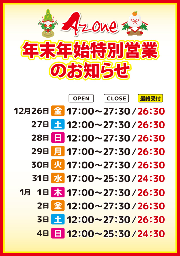 年末年始特別営業のお知らせ Posted on 2025年12月24日 by 朝日会館 Azoneの年末年始は特別営業となります。 友達・ご家族とお誘い合わせの上、ぜひAzoneで楽しい年の瀬・年初めをお過ごしください!