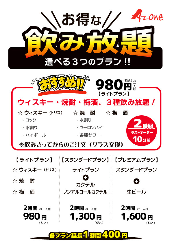 カラオケ カラオケルームは全部で12部屋、すべてデザインや広さが異なり、お客様の人数やご要望に合わせてお選びいただけます。 ○超お得な飲み放題プランあり! 18時以降のお客様へ、大変お得なアルコール飲み放題プランをご用意しております。