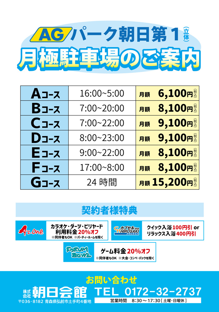 AGパーク朝日は、お得な月極契約も承っております。